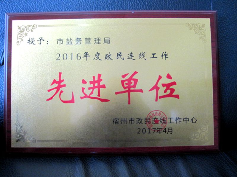 近日,宿州市政民連線(xiàn)工作中心通報(bào)表彰了2016年度全市政民連線(xiàn)工作先進(jìn)單位和個(gè)人,宿州市鹽務(wù)局被授予“2016年度政民連線(xiàn)工作先進(jìn)單位”稱(chēng)號(hào)。