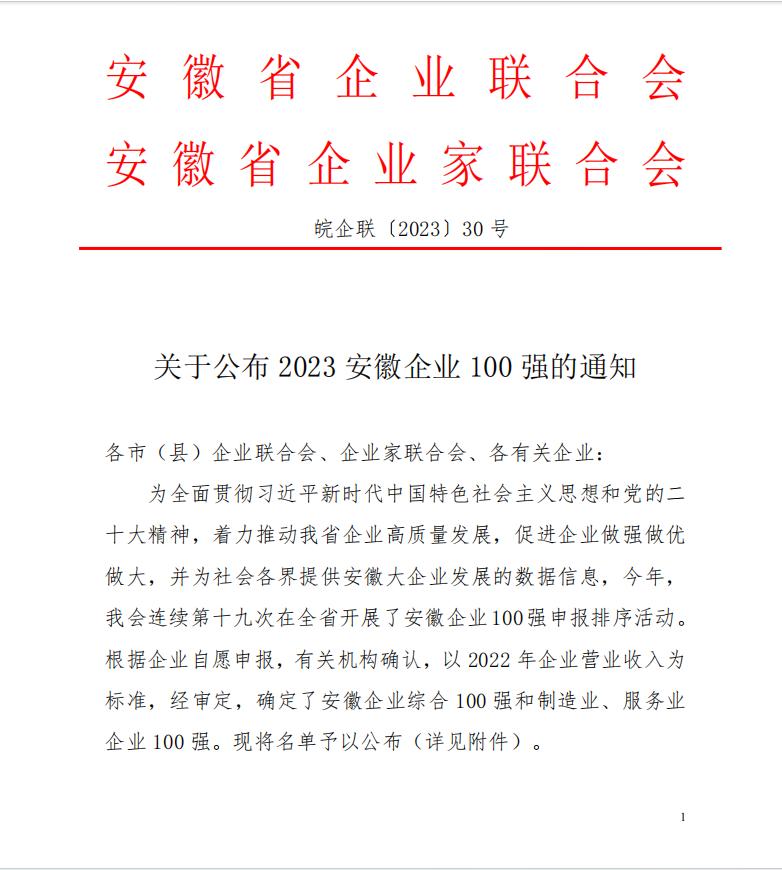 2023年11月22日,安徽省企業(yè)聯(lián)合會、安徽省企業(yè)家聯(lián)合會舉辦了2023安徽百強企業(yè)發(fā)布會暨企業(yè)家論壇,現(xiàn)場發(fā)布了“2023安徽省百強企業(yè)”榜單,及“2023安徽省制造業(yè)百強企業(yè) ”“2023安徽省服務(wù)業(yè)百強企業(yè)”榜單。該活動迄今已經(jīng)連續(xù)開展十九屆,基本囊括了安徽營收規(guī)模排在前列的各類企業(yè)。