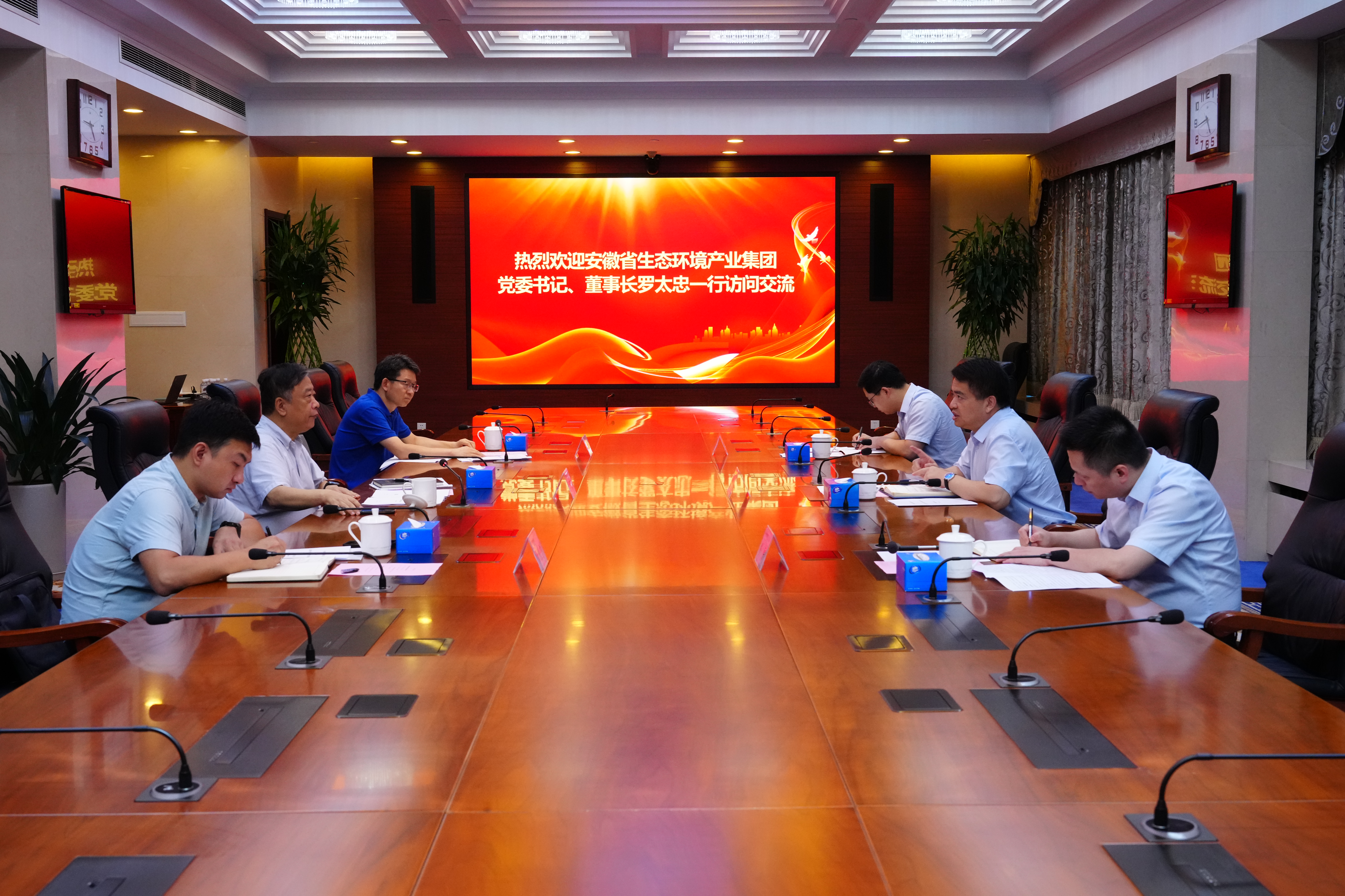 ▲省生態(tài)環(huán)境集團(tuán)黨委書記、董事長(zhǎng)羅太忠與與中國節(jié)能集團(tuán)黨委書記、董事長(zhǎng)廖家生進(jìn)行交流座談