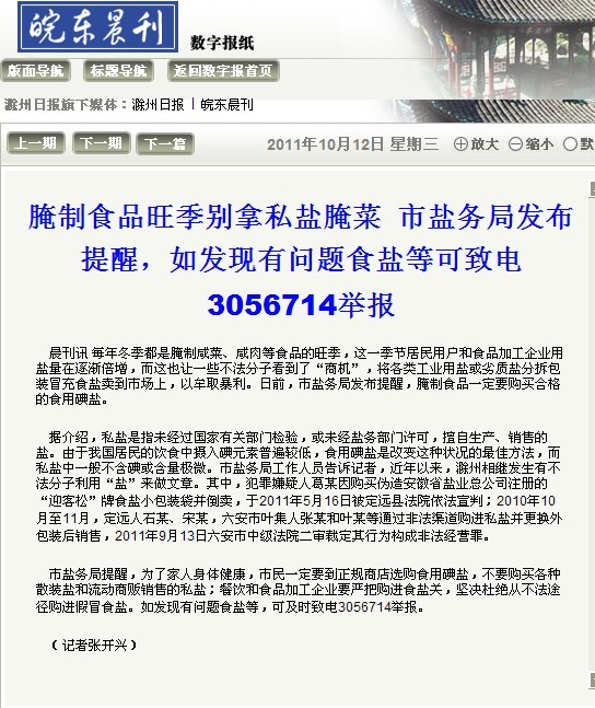市鹽務(wù)局提醒,為了家人身體健康,市民一定要到正規(guī)商店選購食用碘鹽,不要購買各種散裝鹽和流動商販銷售的私鹽;餐飲和食品加工企業(yè)要嚴(yán)把購進食鹽關(guān),堅決杜絕從不法途徑購進假冒食鹽。如發(fā)現(xiàn)有問題食鹽等,可及時致電3056714舉報。