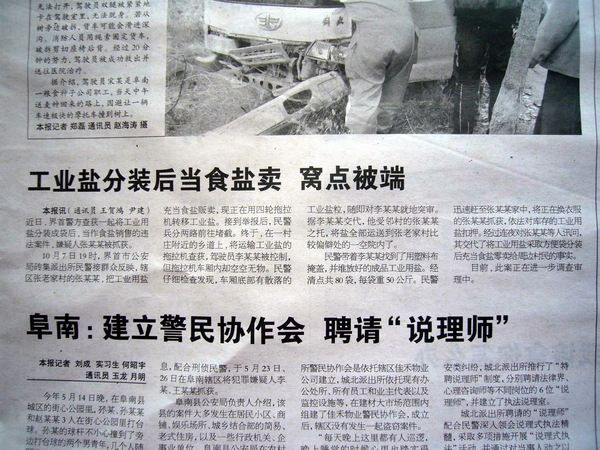 10月7日19時,界首市公安局磚集派出所民警接群眾反映,轄區(qū)張老家村的張某某,把工業(yè)用鹽充當食鹽販賣,現(xiàn)正在用四輪拖拉機轉(zhuǎn)移工業(yè)鹽。接到舉報后,民警兵分兩路前往堵截。終于,在一村莊附近的鄉(xiāng)道上,將運輸工業(yè)鹽的拖拉機查獲,駕駛員李某某被控制,但拖拉機車廂內(nèi)卻空空無物。民警仔細檢查發(fā)現(xiàn),車廂底部有散落的工業(yè)鹽粒,隨即對李某某就地突審。據(jù)李某某交代,他受鄰村的張某某之托,將鹽全部運送到張老家村比較偏僻處的一空院內(nèi)了。