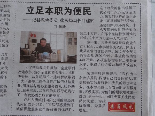 為了幫助我縣竹筍加工企業(yè)順利收儲(chǔ)春筍,減少企業(yè)的資金壓力??h政協(xié)委員、鹽務(wù)局局長葉建輝積極帶領(lǐng)廣大干部職工在全縣推廣誠信供鹽業(yè)務(wù),用真誠與耐心去服務(wù)群眾、服務(wù)基層、服務(wù)三農(nóng),以自己的實(shí)際行動(dòng)踐行了一名政協(xié)委員應(yīng)有的職責(zé)。