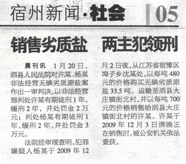 《皖北晨刊》:銷售劣質(zhì)鹽 兩主犯領刑