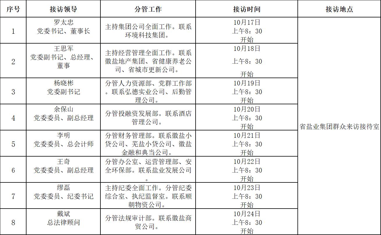 根據(jù)工作安排,現(xiàn)就省鹽業(yè)集團領導班子成員10月份接待省鹽業(yè)系統(tǒng)職工群眾來訪安排公示如下: