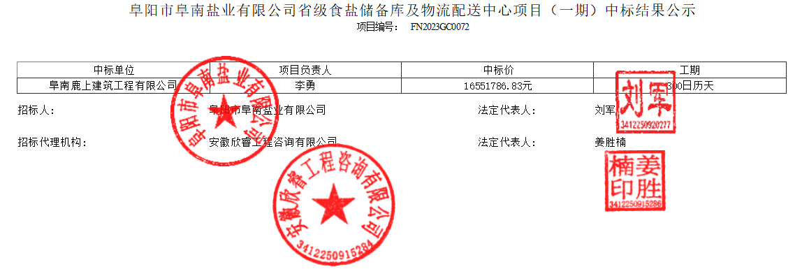 阜陽市阜南鹽業(yè)有限公司省級食鹽儲備庫及物流配送中心項目(一期)中標結(jié)果公示