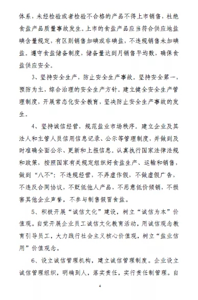 2017年11月6日,為規(guī)范鹽行業(yè)市場主體行為,營造鹽行業(yè)誠信經(jīng)營氛圍,提高鹽行業(yè)社會信用度,中國鹽業(yè)協(xié)會制定《信用鹽業(yè)自律公約(試行)》。該《自律公約》從守法合規(guī)、確保食鹽質(zhì)量與安全、防止安全生產(chǎn)事故、堅持誠信經(jīng)營、開展誠信文化建設(shè)、設(shè)立誠信管理機構(gòu)等6方面進行行業(yè)自律。各食鹽定點批發(fā)企業(yè)、食鹽定點生產(chǎn)企業(yè)和中國鹽業(yè)協(xié)會會員單位可自愿加入信用鹽業(yè)自律公約。