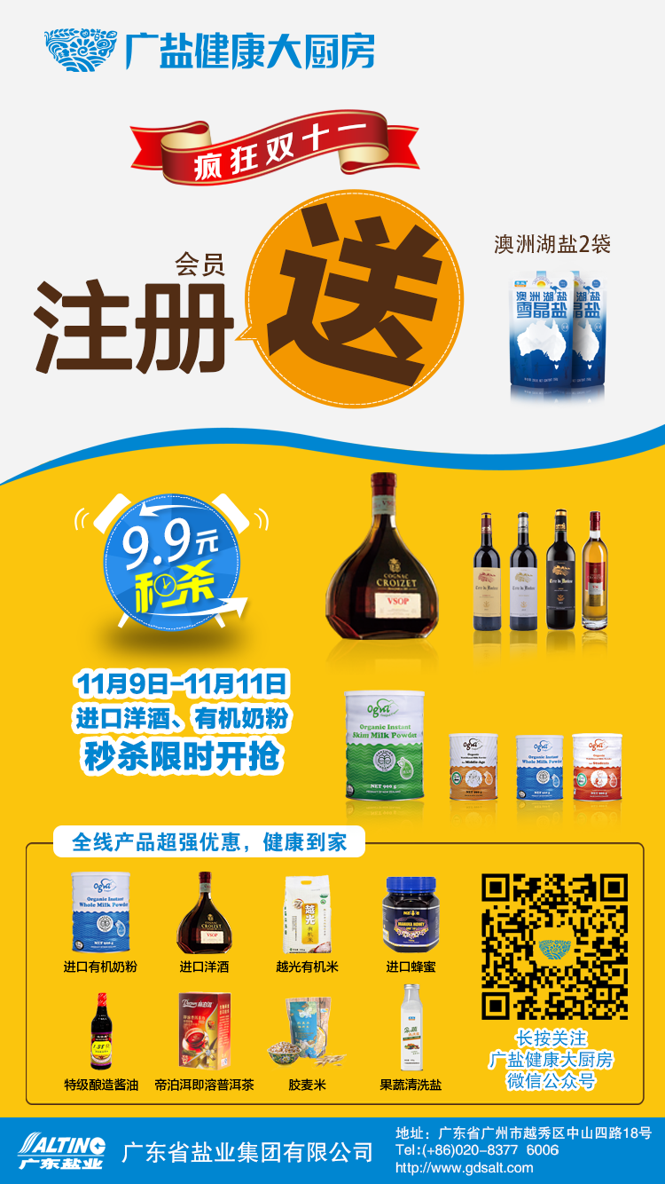 廣東省鹽業(yè)集團(tuán)在11月組織開展全省統(tǒng)一的廣鹽健康大廚房“雙11” 營(yíng)銷活動(dòng)?;顒?dòng)期間,用戶關(guān)注“廣鹽健康大廚房”微信公眾號(hào)(微信號(hào):gyjkdcf)并注冊(cè)為會(huì)員的,每人均可免費(fèi)獲贈(zèng)兩包澳洲湖鹽(250g),另外還有多款商品限時(shí)“9.9元秒殺”及全場(chǎng)打折優(yōu)惠活動(dòng),活動(dòng)詳情及參與方式請(qǐng)大家關(guān)注廣鹽健康大廚房。