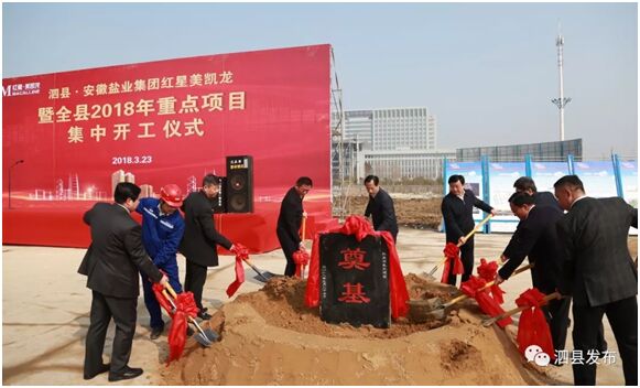 3月23日上午,泗縣縣委縣政府在徽鹽·虹都府項(xiàng)目紅星美凱龍地塊隆重舉行泗縣·安徽鹽業(yè)集團(tuán)紅星美凱龍暨全縣2018年重點(diǎn)項(xiàng)目集中儀式。縣領(lǐng)導(dǎo)張志強(qiáng)、王法立、趙朝法、龐壯、趙明等四大班子成員、安徽鹽業(yè)集團(tuán)徽鹽地產(chǎn)領(lǐng)導(dǎo)程群、泗縣項(xiàng)目全體人員及縣直有關(guān)單位、40個(gè)集中開工項(xiàng)目負(fù)責(zé)人等出席了奠基儀式。