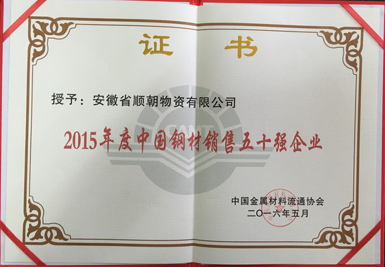 2016年5月27日,第三屆中國(guó)鋼鐵產(chǎn)業(yè)企業(yè)家峰會(huì)在山東省濱州市隆重開(kāi)幕,本次峰會(huì)由中國(guó)金屬材料流通協(xié)會(huì)和濱州市博興縣人民政府聯(lián)合主辦,來(lái)自中國(guó)鋼鐵工業(yè)協(xié)會(huì)、中國(guó)施工企業(yè)管理協(xié)會(huì)、中國(guó)汽車(chē)工業(yè)協(xié)會(huì)等上下游行業(yè)協(xié)會(huì)領(lǐng)導(dǎo)、鋼鐵生產(chǎn)、流通、終端用戶等全產(chǎn)業(yè)鏈企業(yè)家近500人出席。會(huì)上,安徽順朝第三次蟬聯(lián)中國(guó)金屬材料流通協(xié)會(huì)授予的“中國(guó)鋼材銷(xiāo)售五十強(qiáng)企業(yè)”稱(chēng)號(hào)。