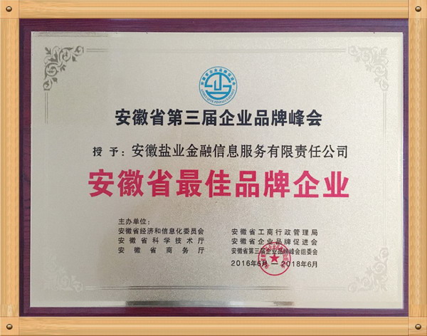 2016年6月18日,由安徽省經(jīng)濟和信息化委員會、安徽省科學技術(shù)廳、安徽省商務(wù)廳、安徽省工商行政管理局、安徽省企業(yè)品牌促進會,共同舉辦的“安徽省笫三屆企業(yè)品牌峰會”在省人大會議中心舉行。安徽鹽業(yè)金融信息服務(wù)有限責任公司(簡稱徽鹽金融)榮獲“安徽省最佳品牌企業(yè)”獎項并受邀參加本次會議。