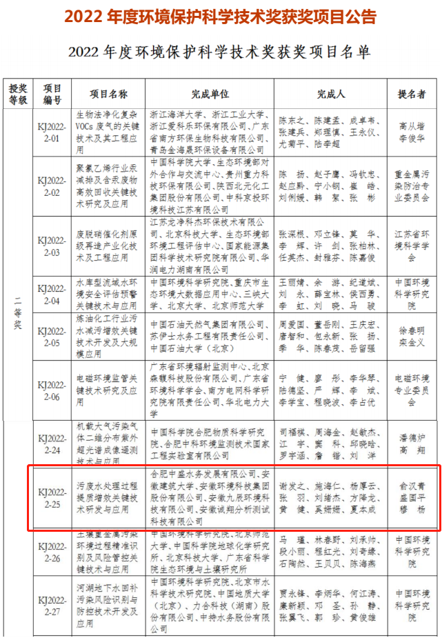 近日,中國環(huán)境科學學會對外發(fā)布了2022年度環(huán)境保護科學技術(shù)獎獲獎名單,由安徽環(huán)境科技集團與合肥中盛水務、安徽建筑大學等單位共同研發(fā)攻關(guān)的技術(shù)成果“污廢水處理過程提質(zhì)增效關(guān)鍵技術(shù)研發(fā)與應用”榮獲二等獎。