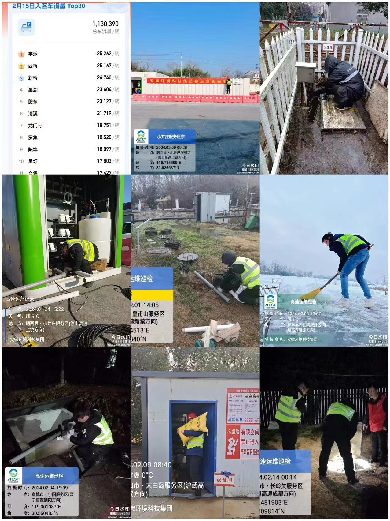 春運期間,安徽高速部分服務區(qū)超歷史最大客流量,針對污水超量嚴重的服務區(qū),環(huán)境科技集團公司統(tǒng)籌安排,將高速服務區(qū)污水外運至附近項目公司場站進行處置。除夕至年初一期間,環(huán)境科技集團公司利用高速客流短時回落的窗口期,緊急協(xié)調調試檢修設備,確保返程高峰期運維服務質量。年初五夜間,由外單位負責運維的陳埠服務區(qū)突發(fā)泵站故障,接到協(xié)助請求后,環(huán)境科技集團公司不講條件,連夜組織運維人員趕赴現(xiàn)場,迅速完成搶修,以實際行動踐行國企擔當。