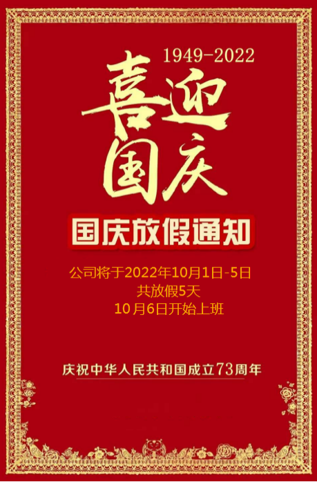 尊敬的廣大客戶: 您們好!2022國慶將至,我司國慶節(jié)放假安排如下:2022年10月1日—5日放假,共計(jì)5天!10月6日(星期四)開始上班,不便之處敬請(qǐng)諒解!? 大家節(jié)日快樂,生意興?。?2022-09-28查看詳情 -