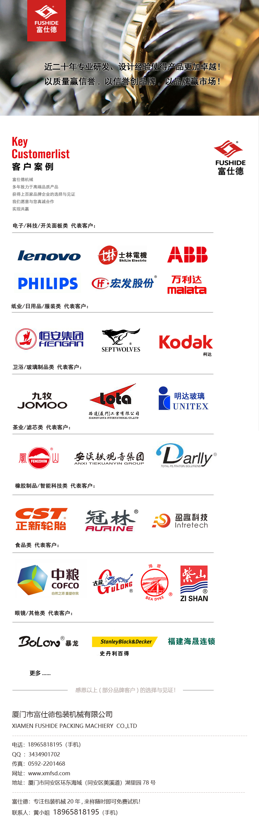 富仕德包裝機(jī)械公司坐落于廈門市,創(chuàng)建于一九九八年,是一家專業(yè)從事科研、設(shè)計(jì)、制造和銷售熱收縮機(jī),熱收縮包裝機(jī),熱收縮膜包裝機(jī),全自動(dòng)熱收縮包裝機(jī),全自動(dòng)熱收縮膜包裝機(jī)為一體的實(shí)業(yè)公司,生產(chǎn)多個(gè)系列的包裝機(jī)械產(chǎn)品:包括熱收縮機(jī),全自動(dòng)熱收縮包裝機(jī),熱收縮包裝機(jī),全自動(dòng)熱收縮膜包裝機(jī),熱收縮膜機(jī),熱收縮膜,收縮膜包裝機(jī),熱收縮膜機(jī),食品包裝機(jī),茶葉包裝機(jī),多功能包裝機(jī),全自動(dòng)包裝機(jī),開箱機(jī),封箱機(jī),包裝材料,POF熱收縮膜等,客戶遍布全國各地和海外地區(qū),其中福建本地客戶主要集中在廈門、泉州、漳州、福州、莆田等,公司定位于設(shè)計(jì)制造中高端的全自動(dòng)熱收縮膜包裝機(jī)械:包括食品包裝機(jī)、陶瓷包裝機(jī)、茶葉包裝機(jī)、壁紙包裝機(jī)、濾芯包裝機(jī)、飲料包裝機(jī)、衛(wèi)浴包裝機(jī)、日化產(chǎn)品包裝機(jī)、電子包裝機(jī)、五金包裝機(jī)、橡膠制品包裝機(jī)、墻紙包裝機(jī)、膠帶包裝機(jī)、化妝品包裝機(jī)、保健品包裝機(jī)、印刷品包裝機(jī)、彩盒包裝機(jī)、圓柱體包裝機(jī)、餐具包裝機(jī)、家居用品包裝機(jī)、瑜伽墊包裝機(jī)等適應(yīng)各行業(yè)不同形狀、單件、組合包裝產(chǎn)品;用于各行業(yè)產(chǎn)品的批量化包裝生產(chǎn);技術(shù)領(lǐng)先、制造精良,結(jié)實(shí)耐用; 我們具備廠家:從研發(fā)、生產(chǎn)、銷售、售后,以及穩(wěn)定的質(zhì)量和可控合理的價(jià)格等優(yōu)勢(shì);公司擁有多項(xiàng)國家專利技術(shù)并通過歐盟CE認(rèn)證,產(chǎn)品采用進(jìn)口知名品牌核心部件等,經(jīng)過近20年專業(yè)研發(fā)、設(shè)計(jì)經(jīng)驗(yàn)使得富仕德包裝機(jī)械產(chǎn)品更加卓越、穩(wěn)定、效率更高,更節(jié)約包材成本。