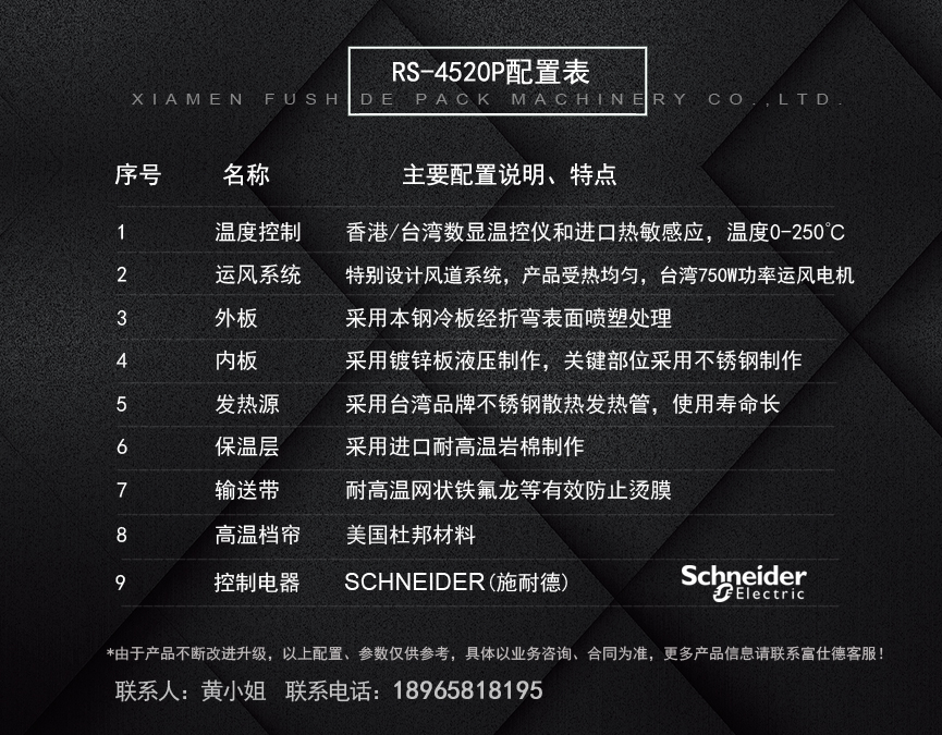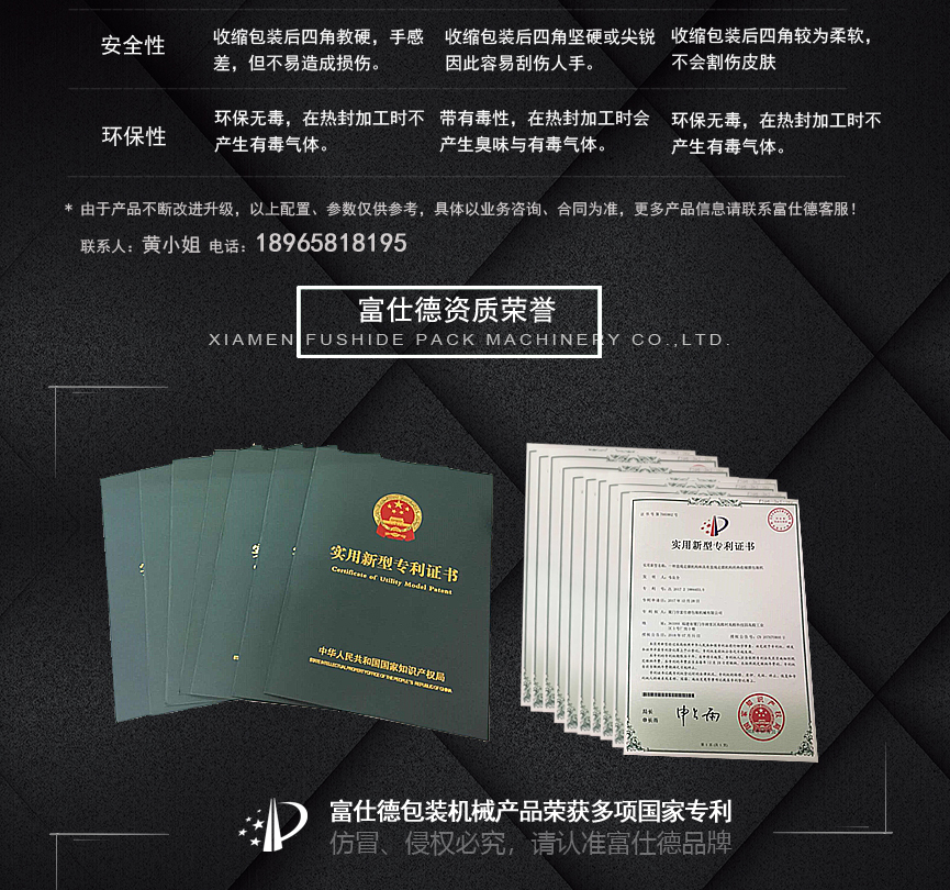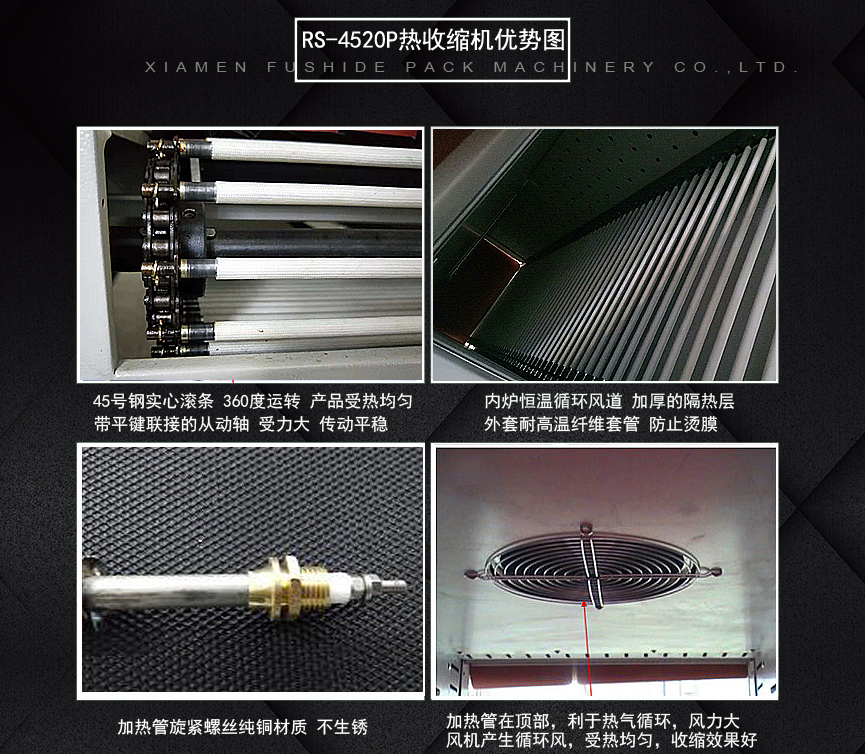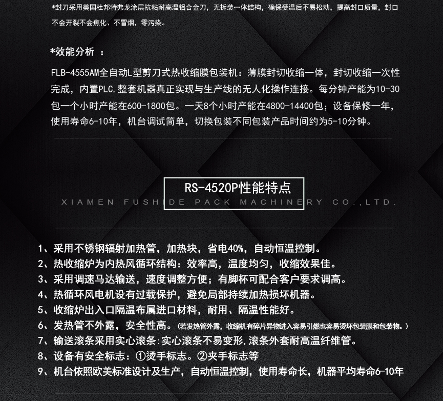 廈門市富仕德包裝機(jī)械有限公司位于福建省廈門市,創(chuàng)建于一九九八年是一家專業(yè)從事熱收縮包裝機(jī)設(shè)計(jì)研發(fā)、制造和銷售于一體的實(shí)業(yè)公司,公司生產(chǎn)多個(gè)系列的包裝機(jī)械產(chǎn)品,并獲得多項(xiàng)國家發(fā)明專利。公司始終一如既往為高端品牌客戶提供可靠的產(chǎn)品,完善的售后服務(wù),與之共同發(fā)展。公司專業(yè)生產(chǎn)的熱收縮膜包裝機(jī)系列:適合各行各業(yè),各種不同形狀、單件、組合包裝產(chǎn)品都能提供針對(duì)性設(shè)備使用的機(jī)型;性能更加穩(wěn)定,效率更高,更節(jié)約包裝成本!