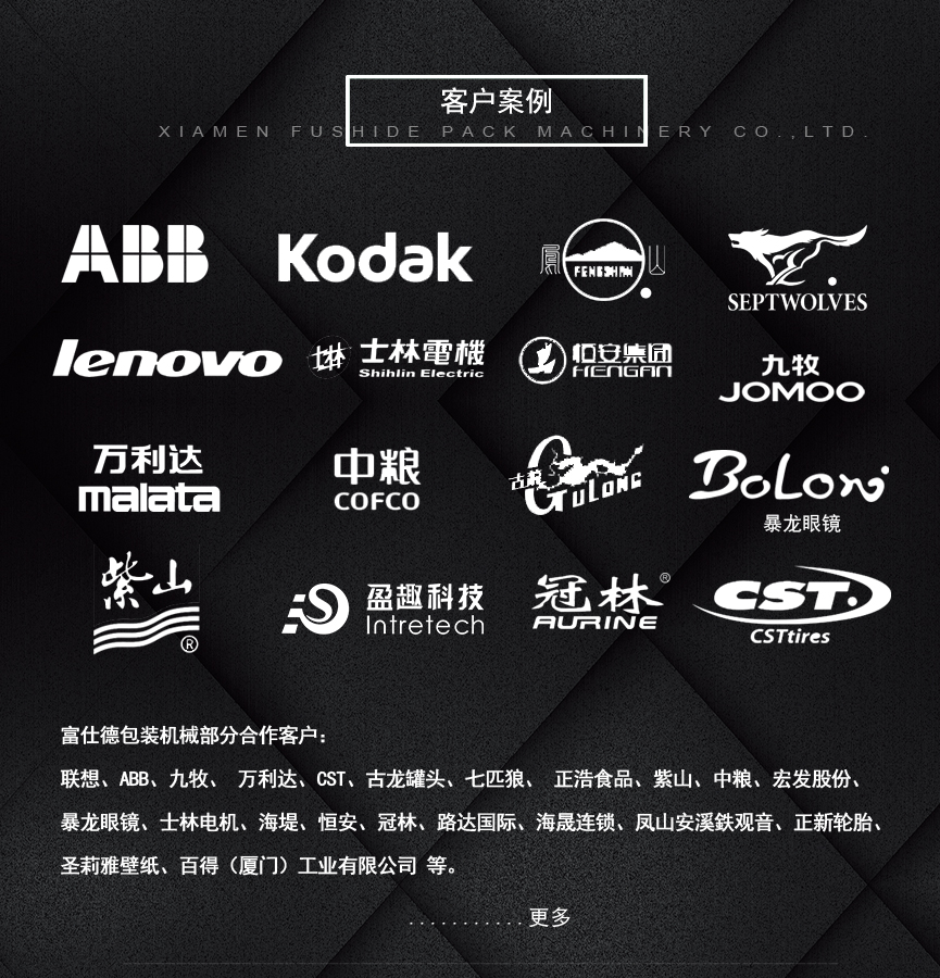 聯(lián)想、ABB、九牧、 萬利達(dá)、CST、古龍罐頭、七匹狼、 正浩食品、紫山、中糧、宏發(fā)股份、暴龍眼鏡、士林電機(jī)、海堤、恒安、冠林、路達(dá)國際、海晟連鎖、鳳山安溪鉄觀音、正新輪胎、圣莉雅壁紙、百得(廈門)工業(yè)有限公司 等。